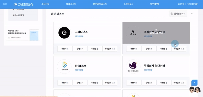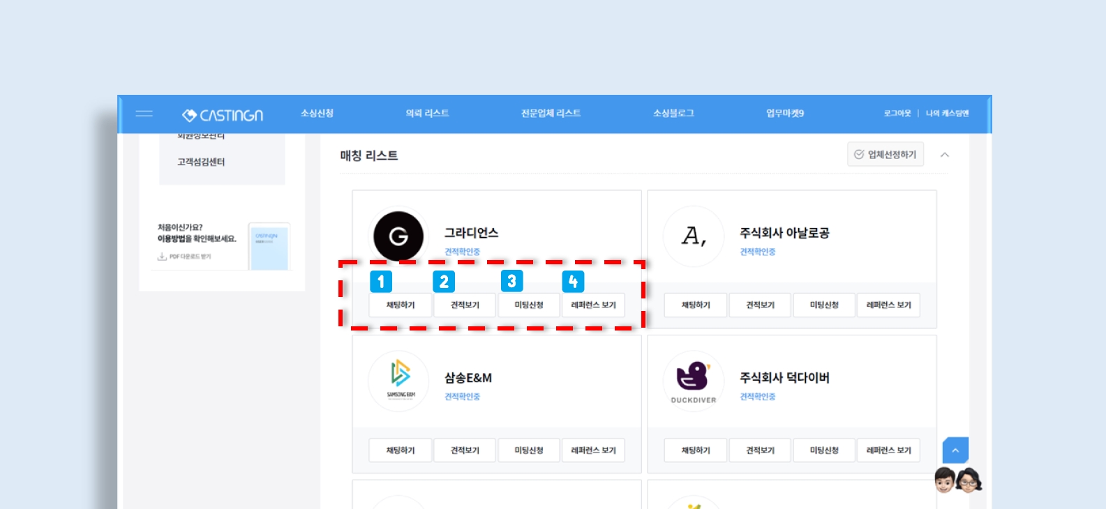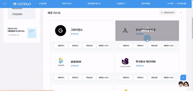 모집 마감일이 지나고 프로젝트와 매칭된 업체들이 확인되셨나요? 이제 외주계약 단계로 가기 위해서는 우리 프로젝트와 전문업체들의 ‘핏’이 맞는지 확인하는 작업이 꼭 필요합니다. 그런 의미에서 ‘미팅’과 ‘견적’ 단계는 업무마켓9(캐스팅엔)이 제공하는 절차 중 가장 중요한 단계라고 할 수 있습니다.