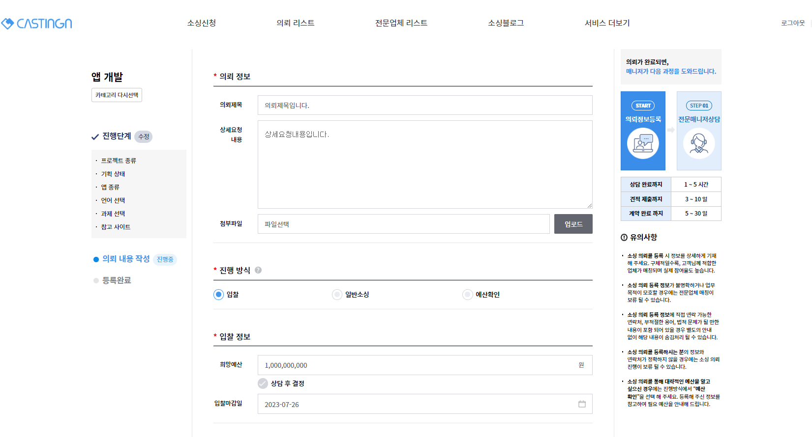 업무마켓9 견적문의 페이지(=캐스팅엔)