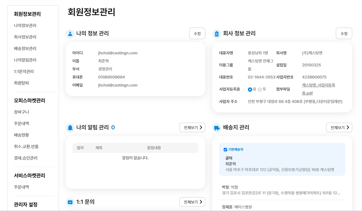 1️⃣ 회원정보 관리 : 내 정보, 회사 정보, 배송 정보 등 정보 확인 및 수정