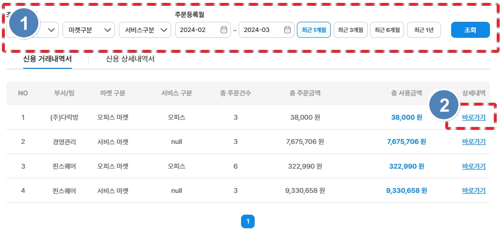 부서별, 마켓별, 서비스별 추가 필터를 활용해서 일정별 신용 거래 내역을 확인할 수 있어요.