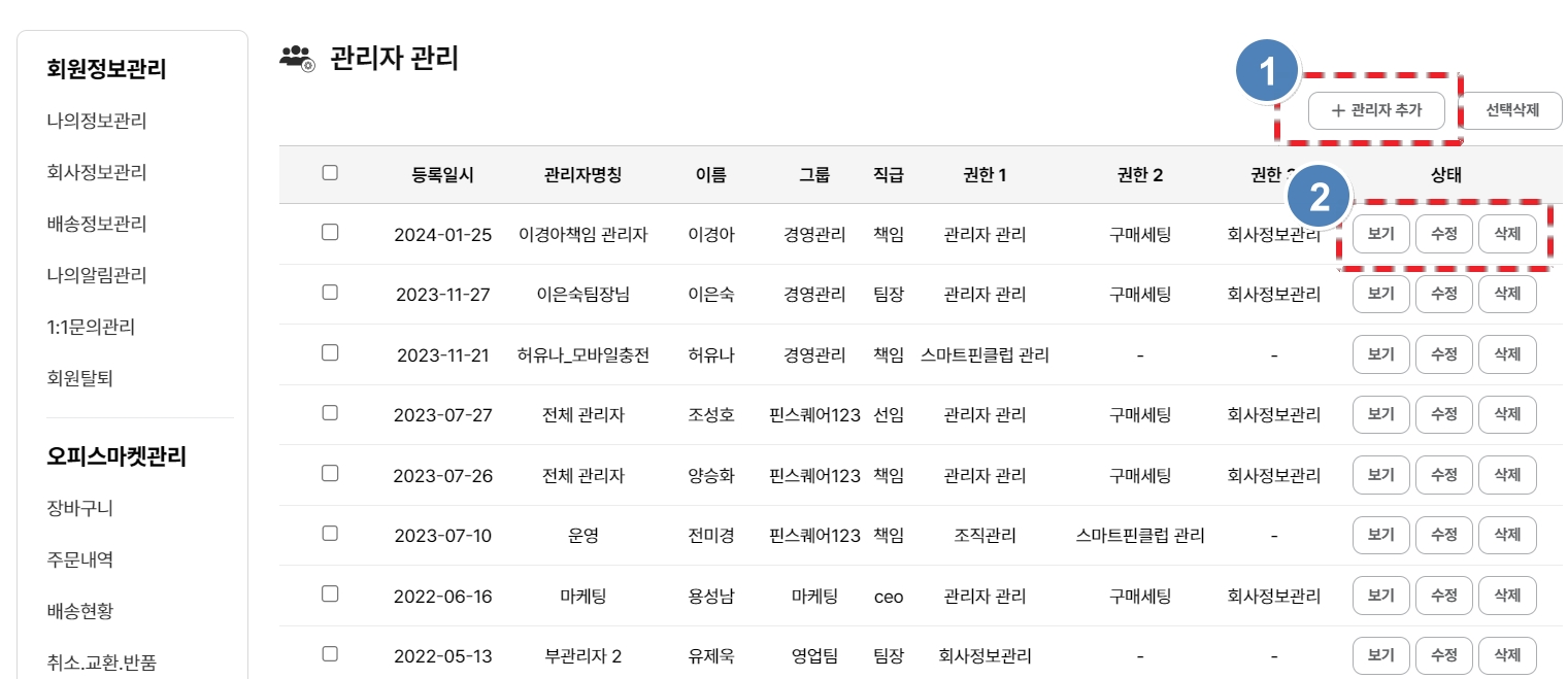이미 설정된 관리자 권한을 확인 및 수정, 삭제 할 수 있습니다.