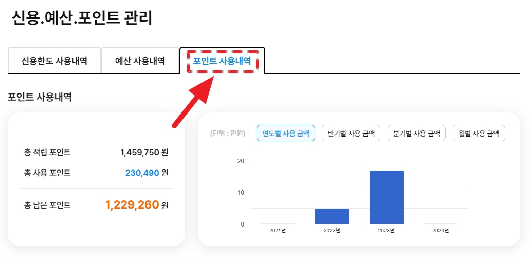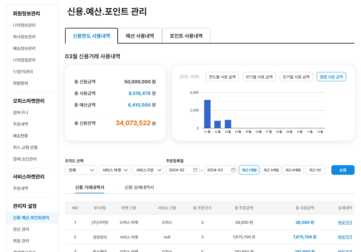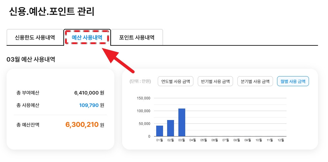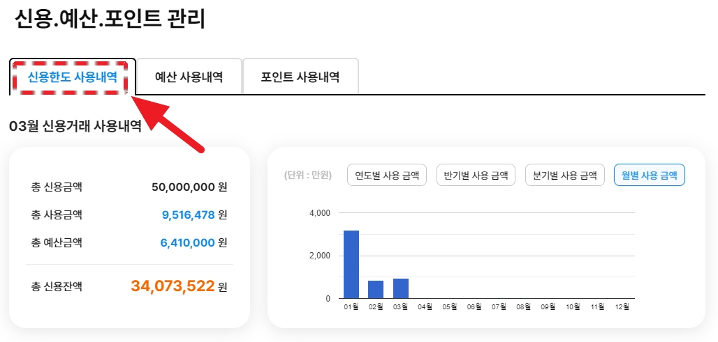 신용.예산.포인트 관리 페이지에서는 신용, 예산, 포인트 등 3가지 거래내역에 대한 관리가 가능합니다.