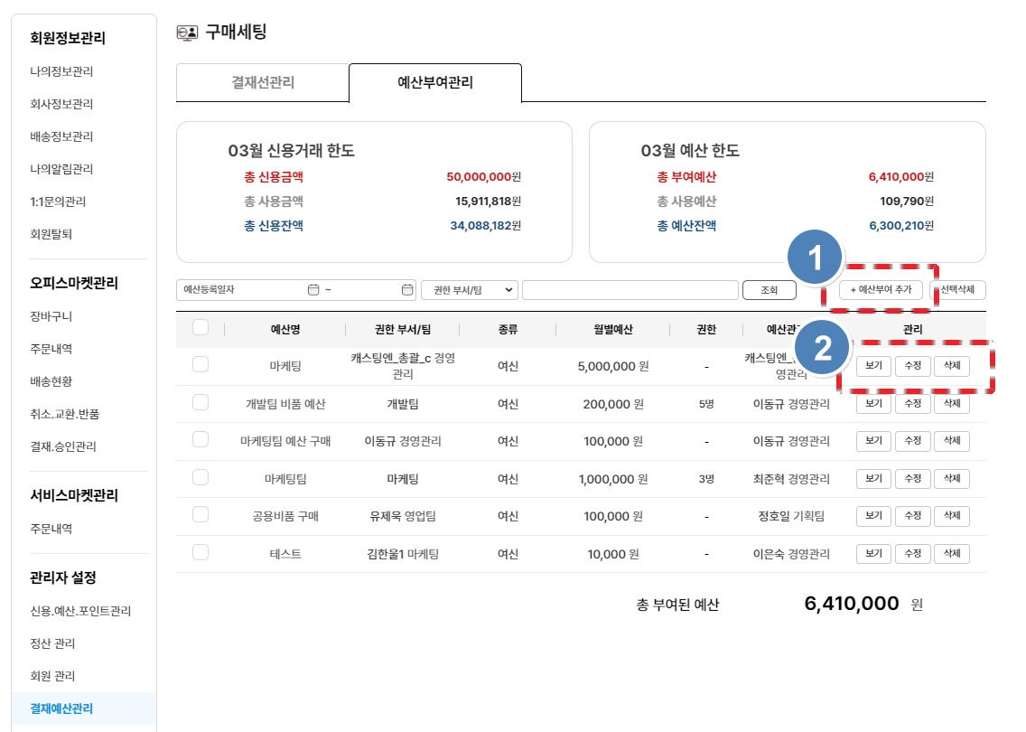 [마이페이지>관리자설정>결재예산관리>예산부여관리(클릭)]에서 예산부여하기가 가능해요!
