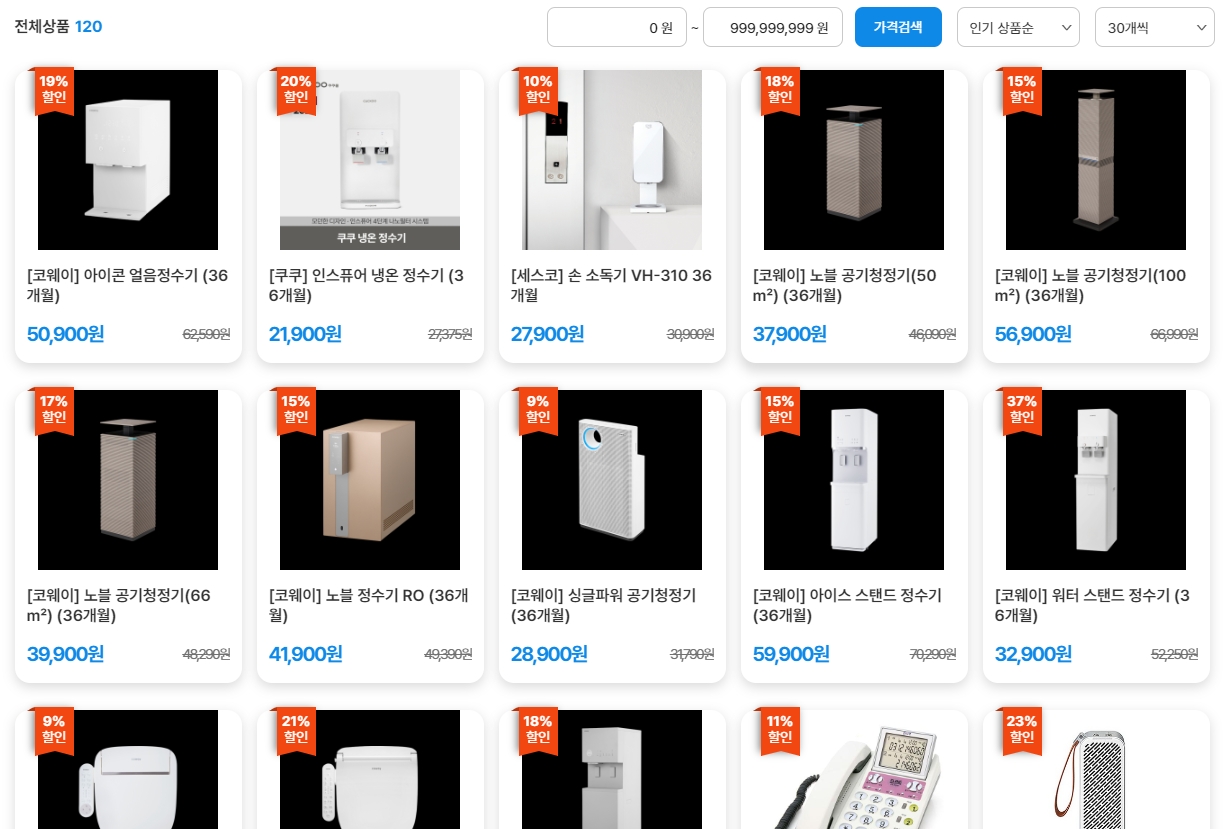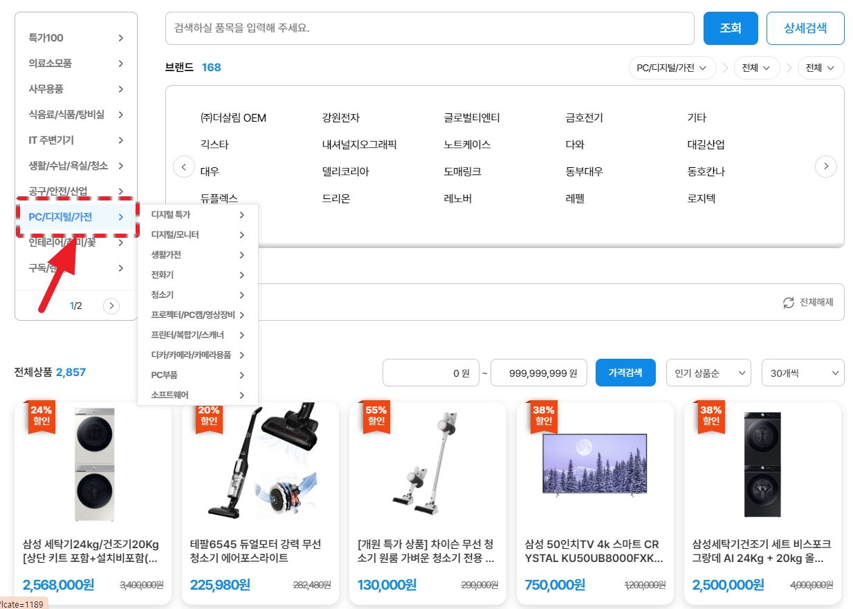 각 카테고리 페이지에서 브랜드별, 제품별, 가격별로 2차 필터가 가능합니다.