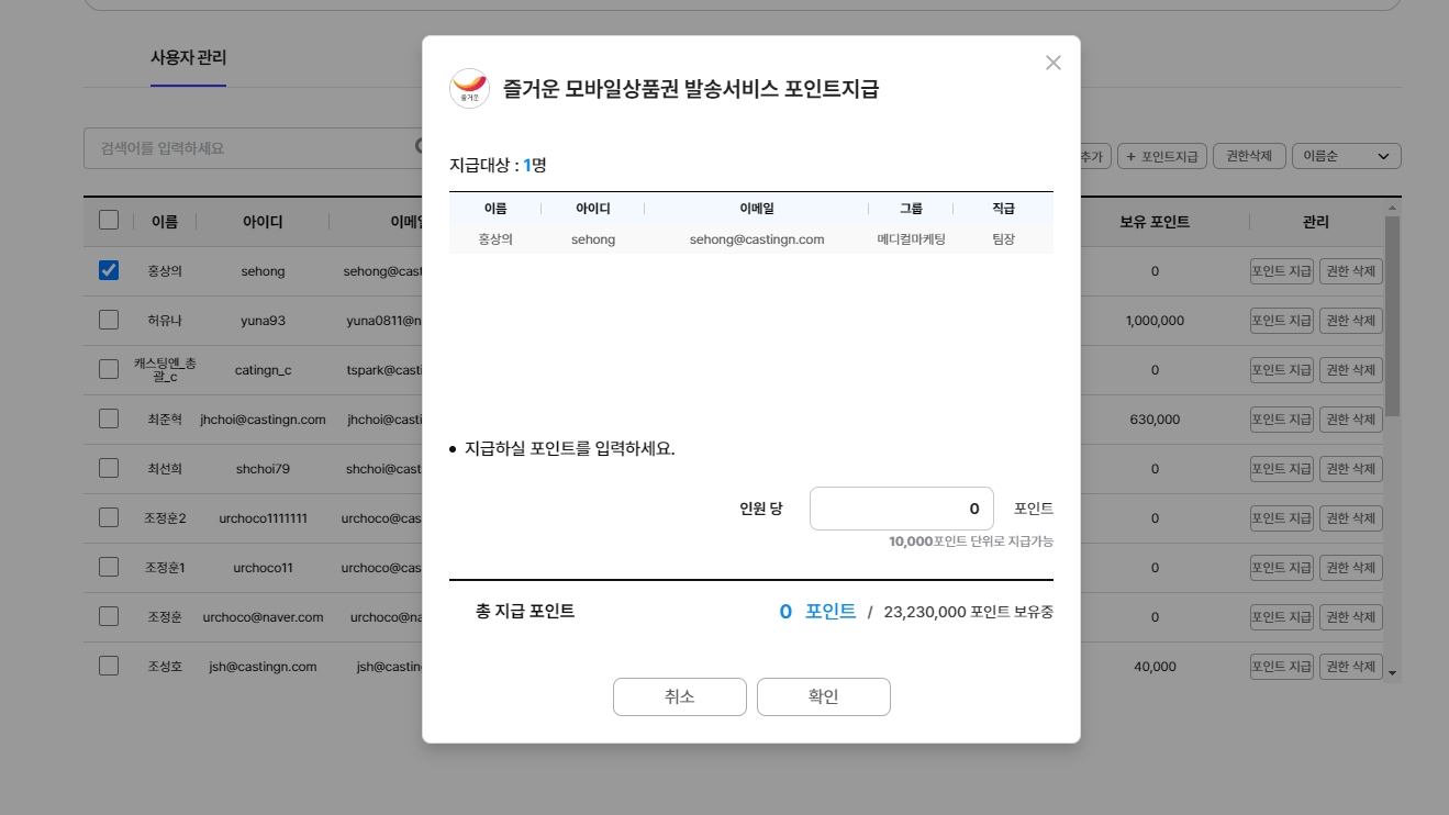 추가한 사용자 중 포인트 지급 대상을 선택합니다.(복수선택가능)