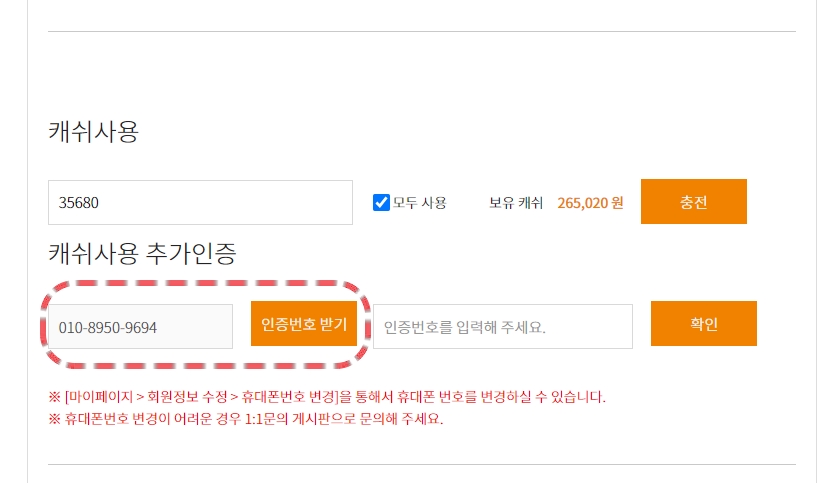 캐쉬(포인트)'를 통해 제품을 구매할 수 있습니다.캐쉬 사용을 진행할 때는 계정과 연결된 핸드폰 인증이 필요합니다.