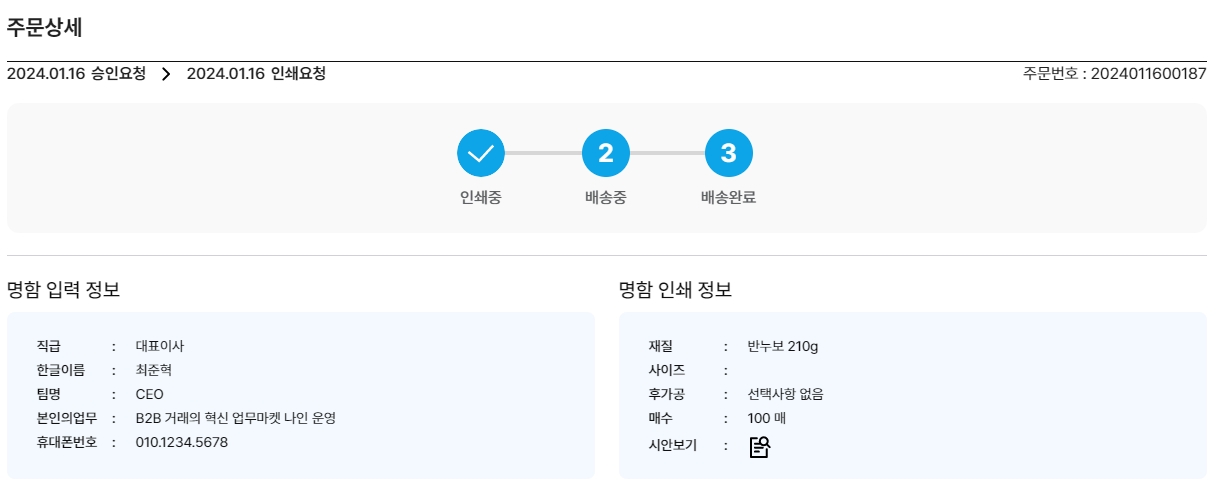 배송 진행상태, 명함 인쇄 정보 등을 상세하게 알 수 있습니다.