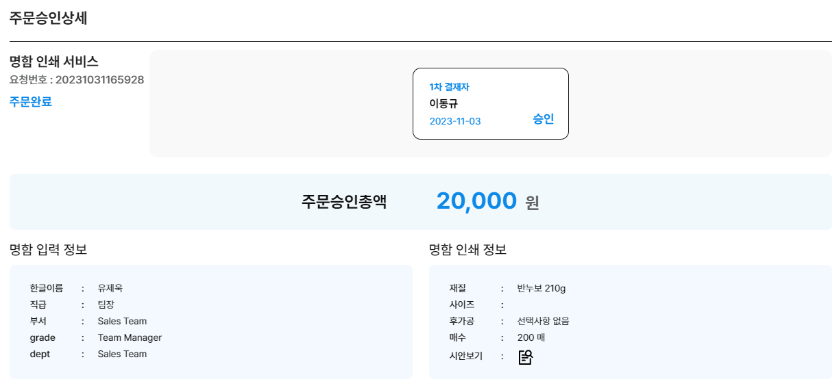 명함 주문 승인 관리 탭 화면
