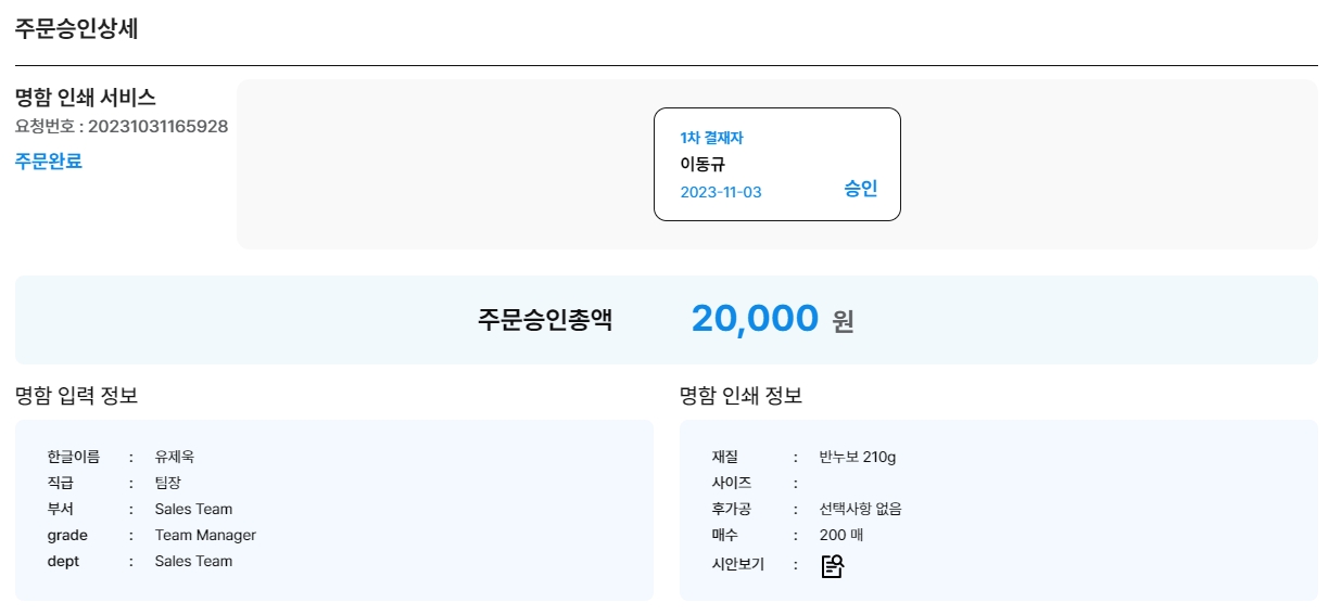 결재자 정보, 금액, 명함 정보, 배송지 정보 등을 확인할 수 있습니다.